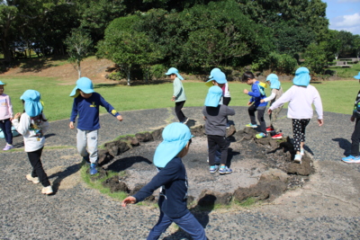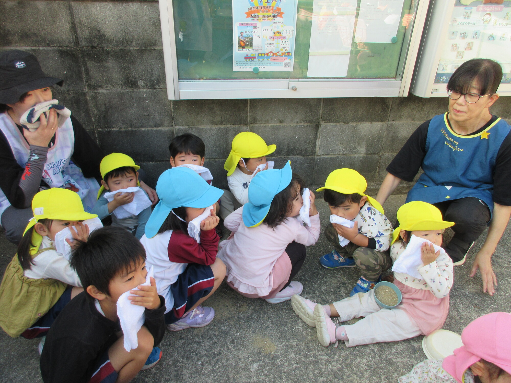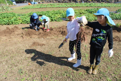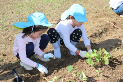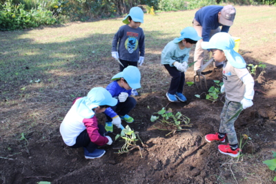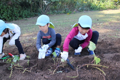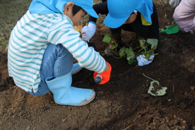子どもたちは、目を輝かせながらお芋を掘る姿が見られました。お芋が取れた時は、満面の笑みで、みんなに見せあっていました。自然の土に触れ、収穫の喜び、実りの秋を満喫しました。