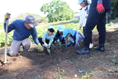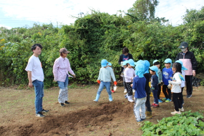 実りの秋を迎え、さんさん富江キャンプ村で芋ほりを行いました。春に予定していた芋の苗植えは、残念ながら雨天のためできず、さんさん富江キャンプ村の方が代わりに苗植えをしてくれました。その感謝を最初に伝え、芋ほりを行いました。