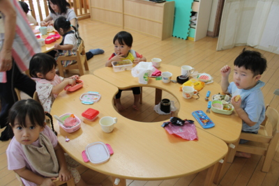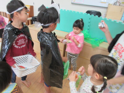 今日は、さきほっこ祭りをしました。キラリチームの子どもたちが、コーナーに分かれて、いろいろな遊びを盛り上げてくれました。すくすくチームの子どもたちは、ヨーヨー釣り、魚釣り、もぐらたたき、輪投げなど楽しむ姿が見られました。最後に現れたさだこのお化けには、驚き、その場から逃げていました。夏の思い出になりました!(^^)!