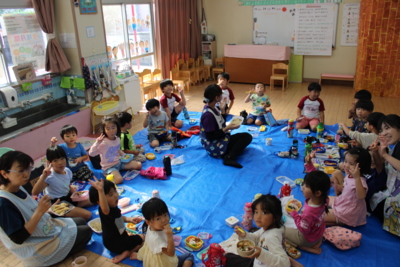 少し早めに「子どもの日のお祝い」をしました。パネルシアターの「食いしんぼうのこいのぼり」のパネルシアターを見たり、みんなに手作りこいのぼりを見せたり、作り方を伝えたりしました。
