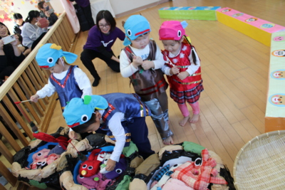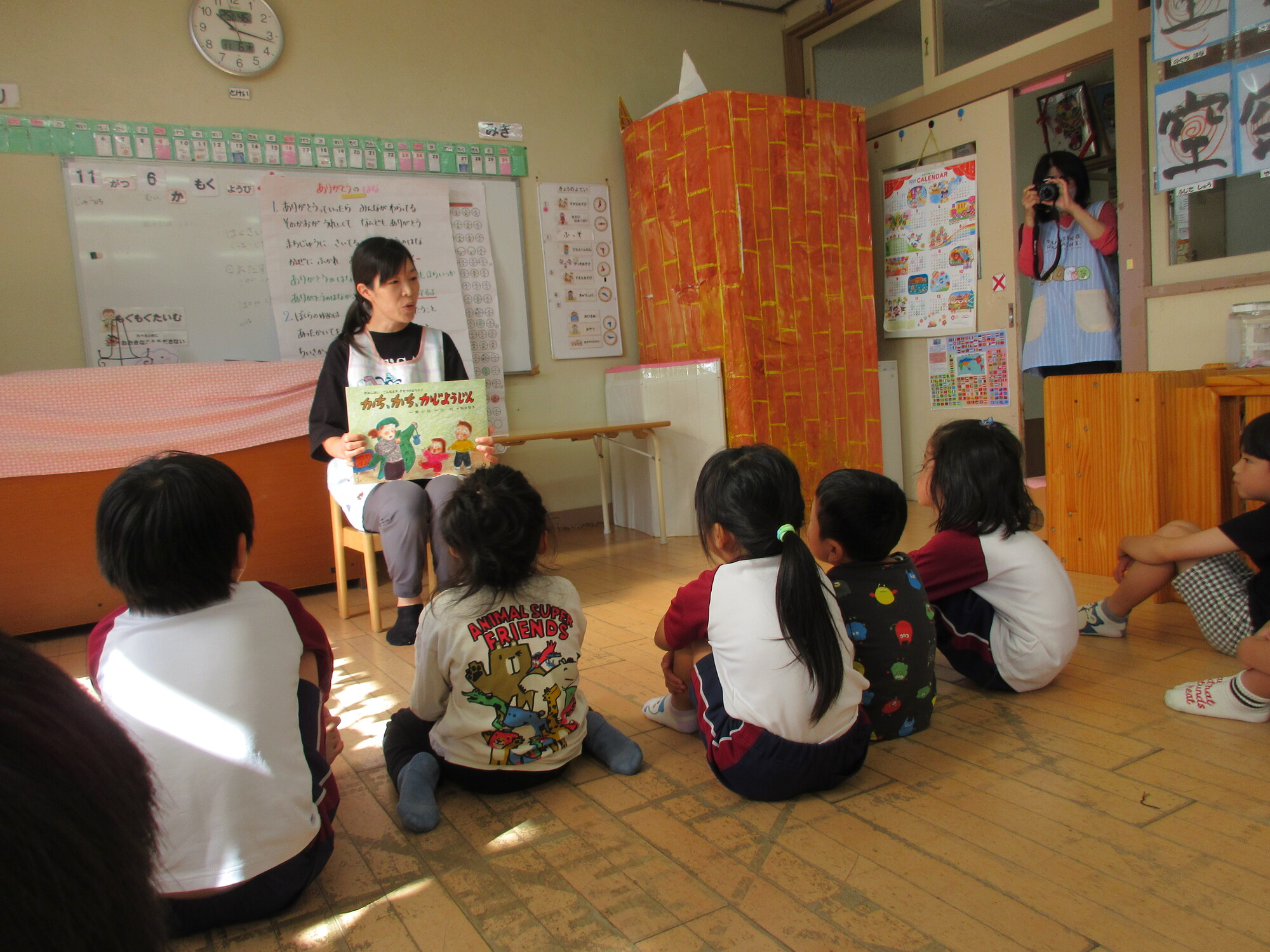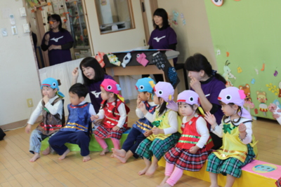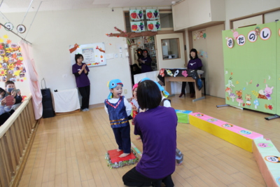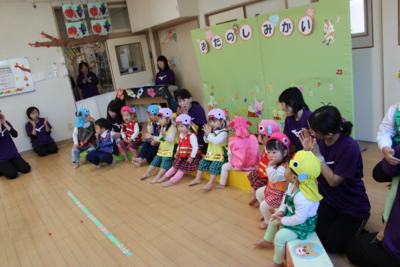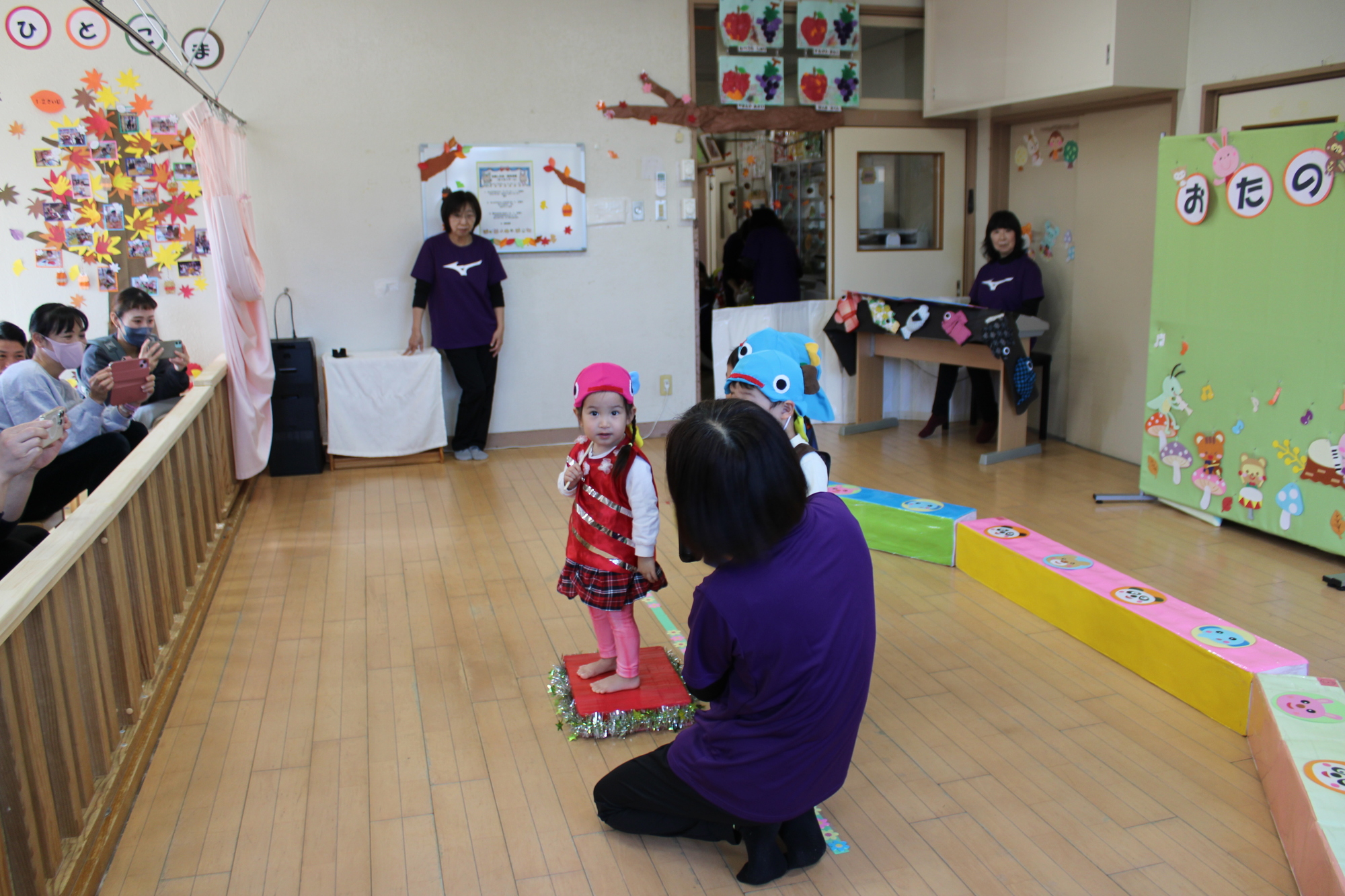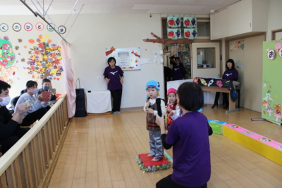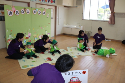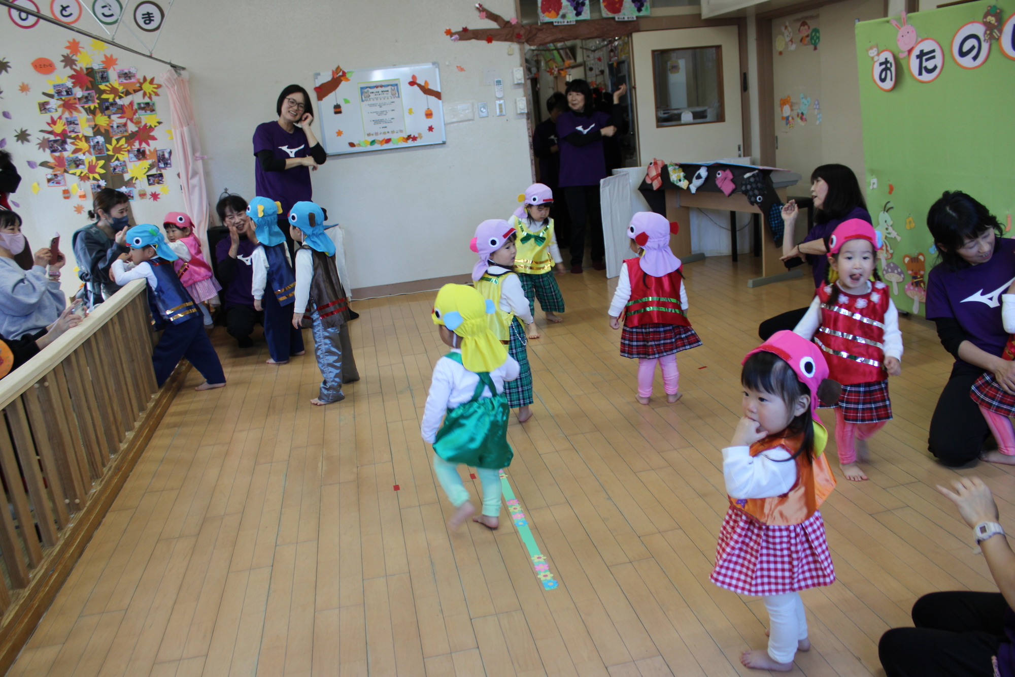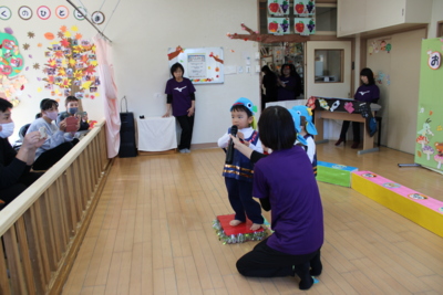 保育参観が行われました。いつもと違って保護者と一緒で、嬉しさと緊張がまじりあっている感じでした。お集まりの様子を見て頂いたり、フープ取り競争では頑張る姿を見て頂きました。また、保護者様とふれあい遊びを楽しみました。わずかの時間でしたが、楽しいひとときを過ごすことができました。