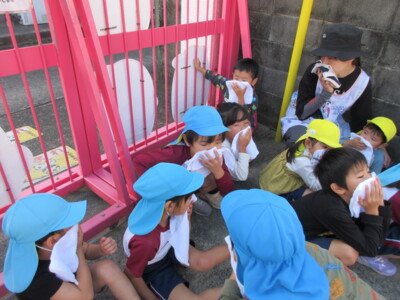 今日は、あいにくの雨でしたが、総合訓練を行いました。五島消防署の3人の消防士さんに来て頂いて実施しました。子どもたちは、「おさない・はしらない・しゃべらない・もどらない」のお約束どおりに落ち着いて避難することができました。消防士さんから上手に避難することができていましたとお褒めのお言葉をいただきました。職員3名は、消火訓練をしました。もしもの時に、子どもたちの命を守っていきたいと思います。