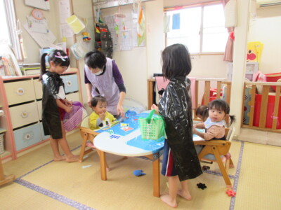 今日は、先日行った夕涼み会を「またしたいね!!」の言葉に「小さいお友達も一緒にやってみたいね!!」話は盛り上がり、皆で夕涼み会の再現遊びを行いました。