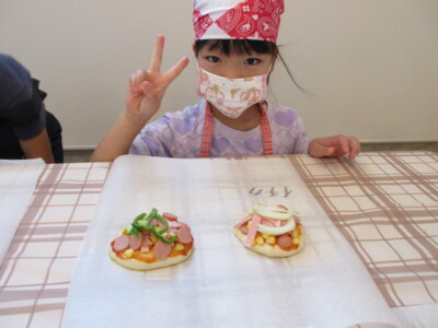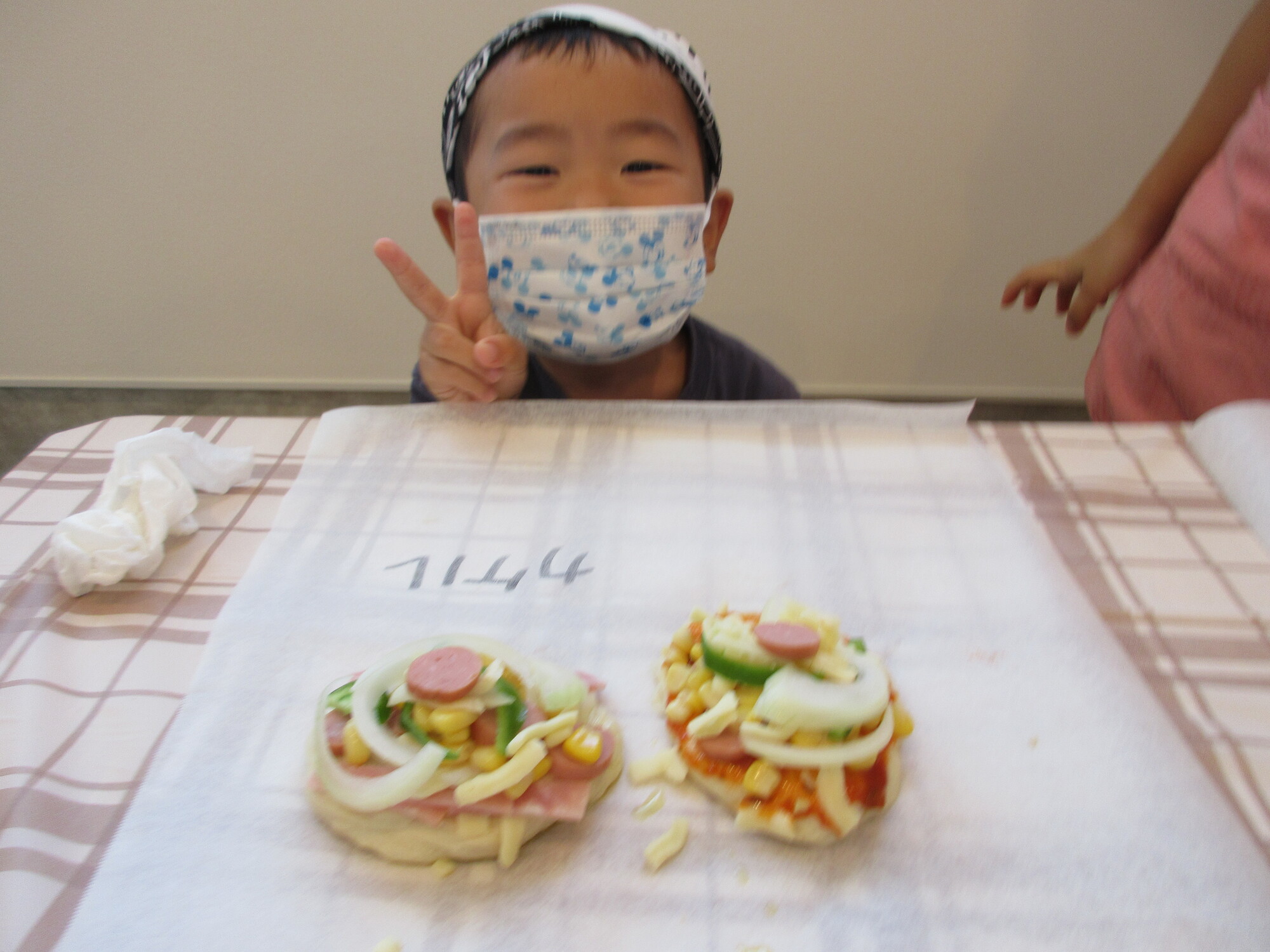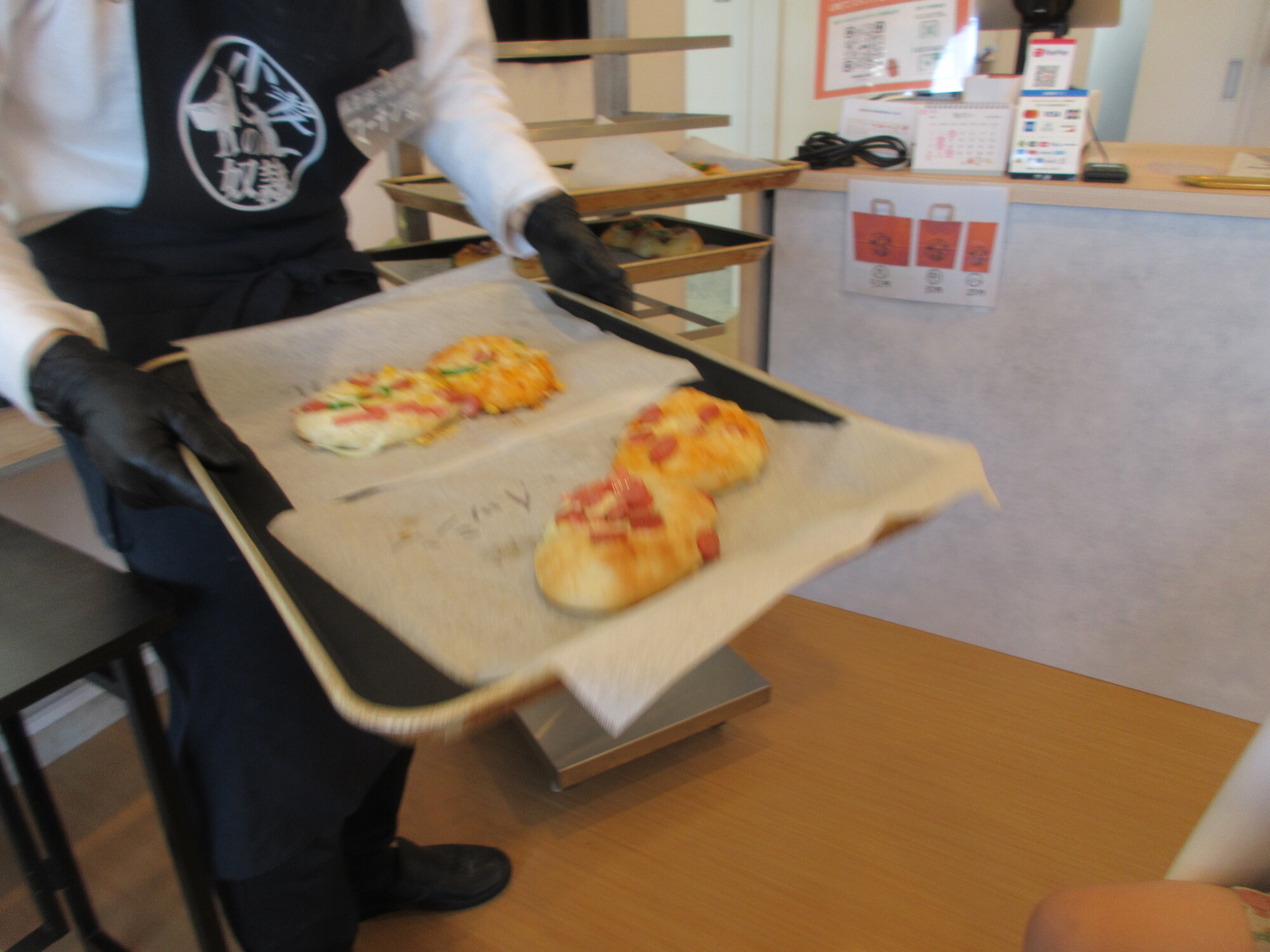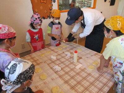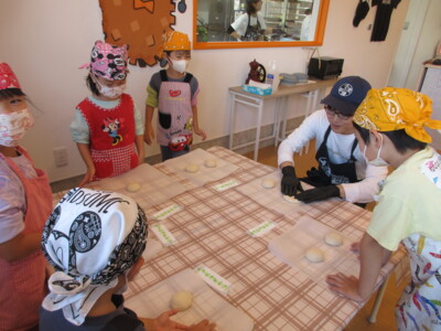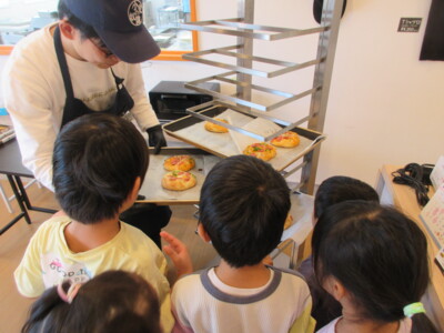 まず、小麦の奴隷さんでパン作りを体験しました。子どもたちは、ワクワクしながらも真剣にパンやさんのお話を聴きパン作りに夢中の様子でした。ピザパンとかめのメロンパンが出来上がりました!(^^)!