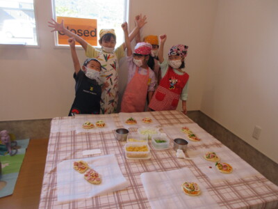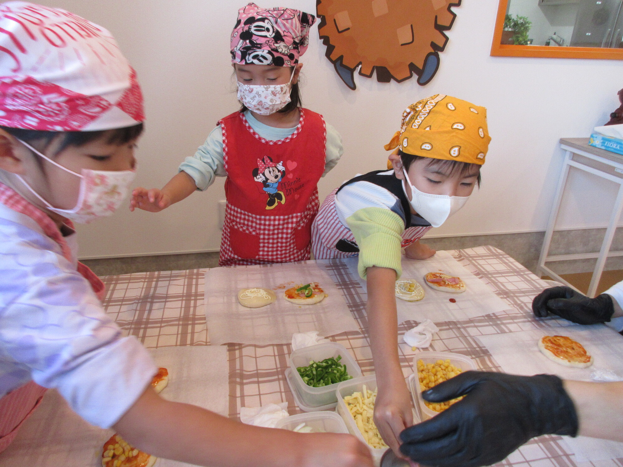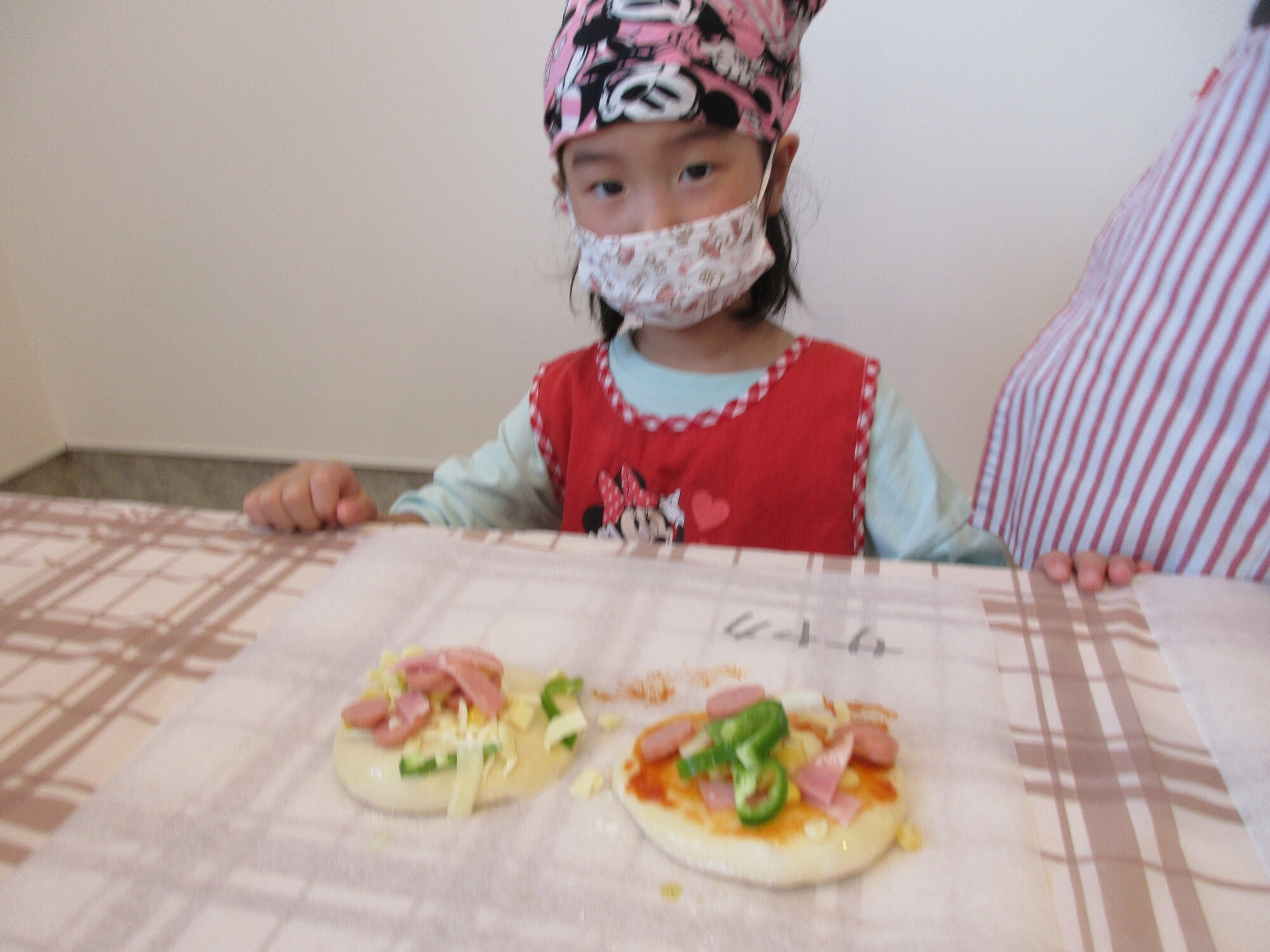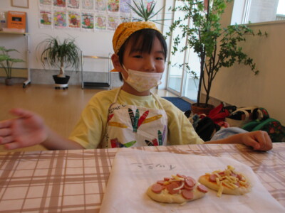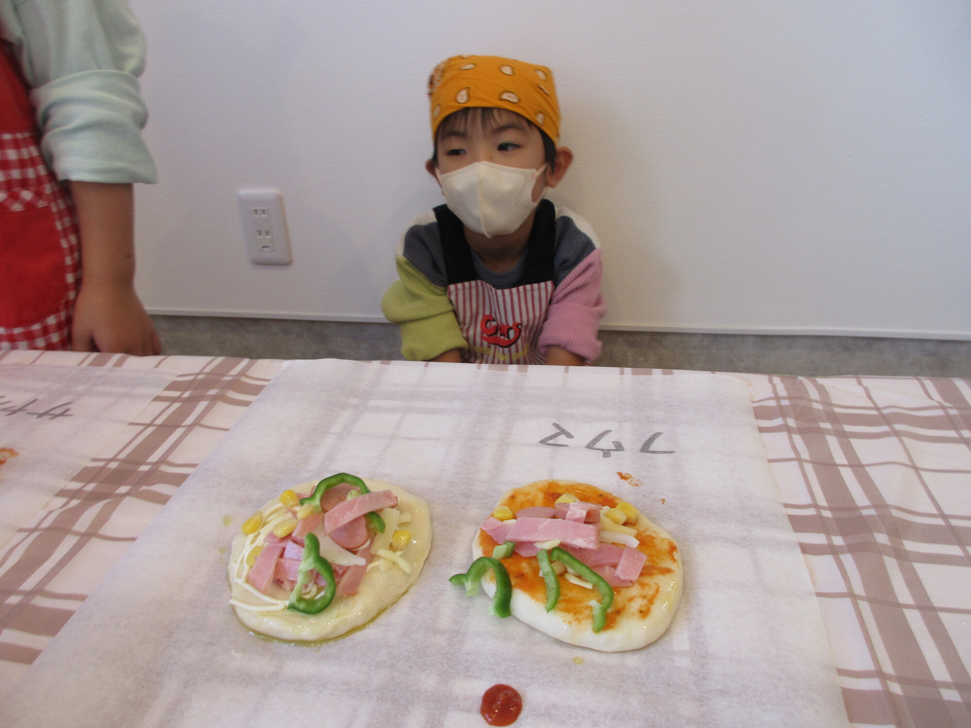 まず、小麦の奴隷さんでパン作りを体験しました。子どもたちは、ワクワクしながらも真剣にパンやさんのお話を聴きパン作りに夢中の様子でした。ピザパンとかめのメロンパンが出来上がりました!(^^)!