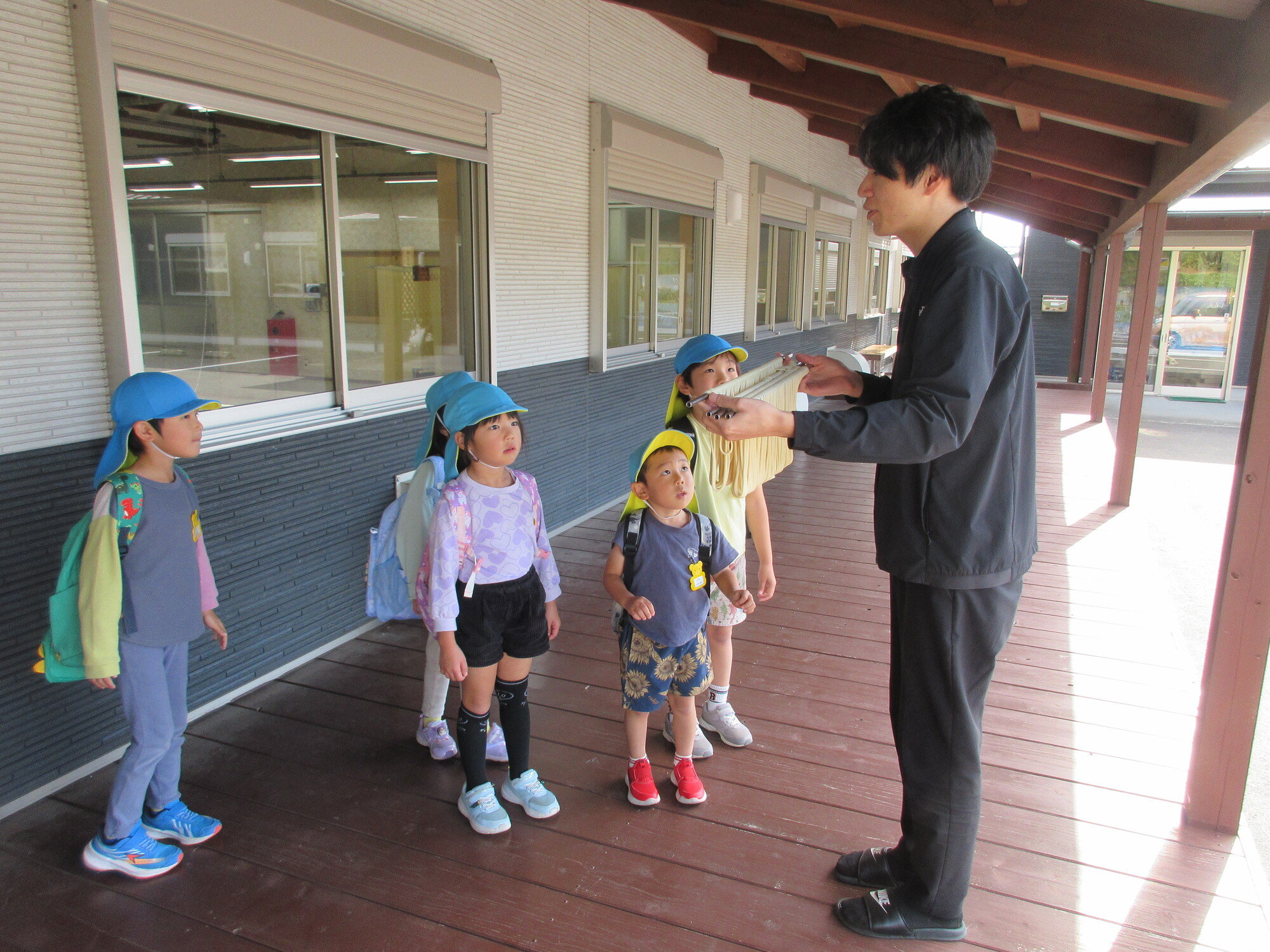 今日は、五島市消防署の消防士さんの指導の下、避難訓練が行われました。子どもたちは、「火事です!!逃げてください」と聞くと保育者の声かけをよく聞き、避難することができました。その後、消防士さんからのお話を落ちついて聞く姿が見られました。皆、上手に逃げることができたことを褒められ、子どもたちは嬉しそうでした。そして、逃げる時は「おかしも」お・・・おさない か・・・かけない(はしらない) し・・・しゃべらないも・・・もどらない の約束をしました。