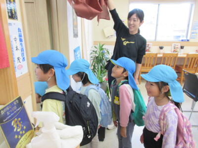 福江小学校の仲良し交流会に5歳児5名が参加しました。1年生のお店やさんで手作りのものをいただいたり、一緒にじゃんけん列車やお誕生月のお友だちを曲に合わせて楽しみました。交流会で小学校への期待や夢が広がったことでしょう!(^^)!