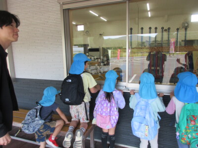 場所を移動し、消防車の見学をしたり、消防車に実際に乗せてもらいました。子どもたちは、消防車に興味関心を持つことができました!(^^)!