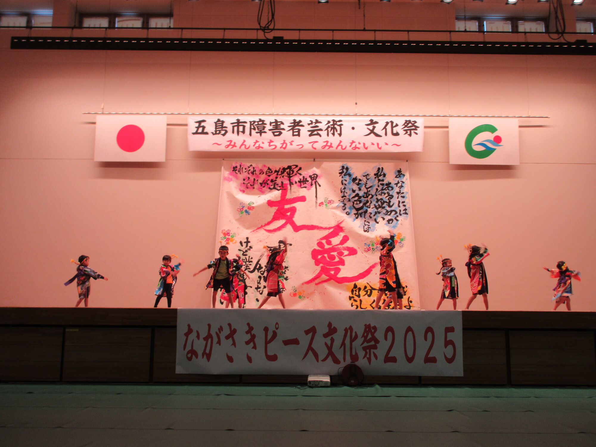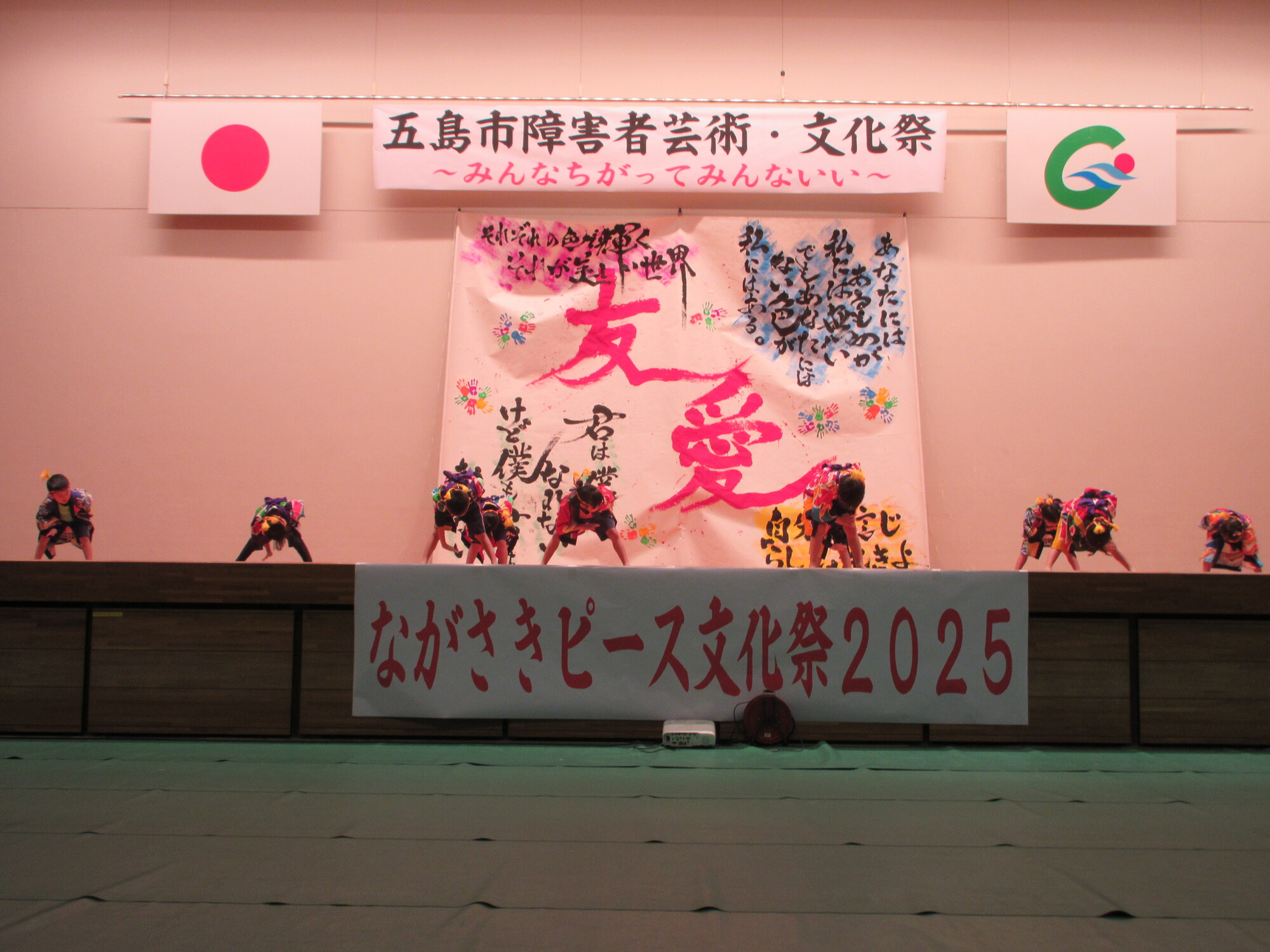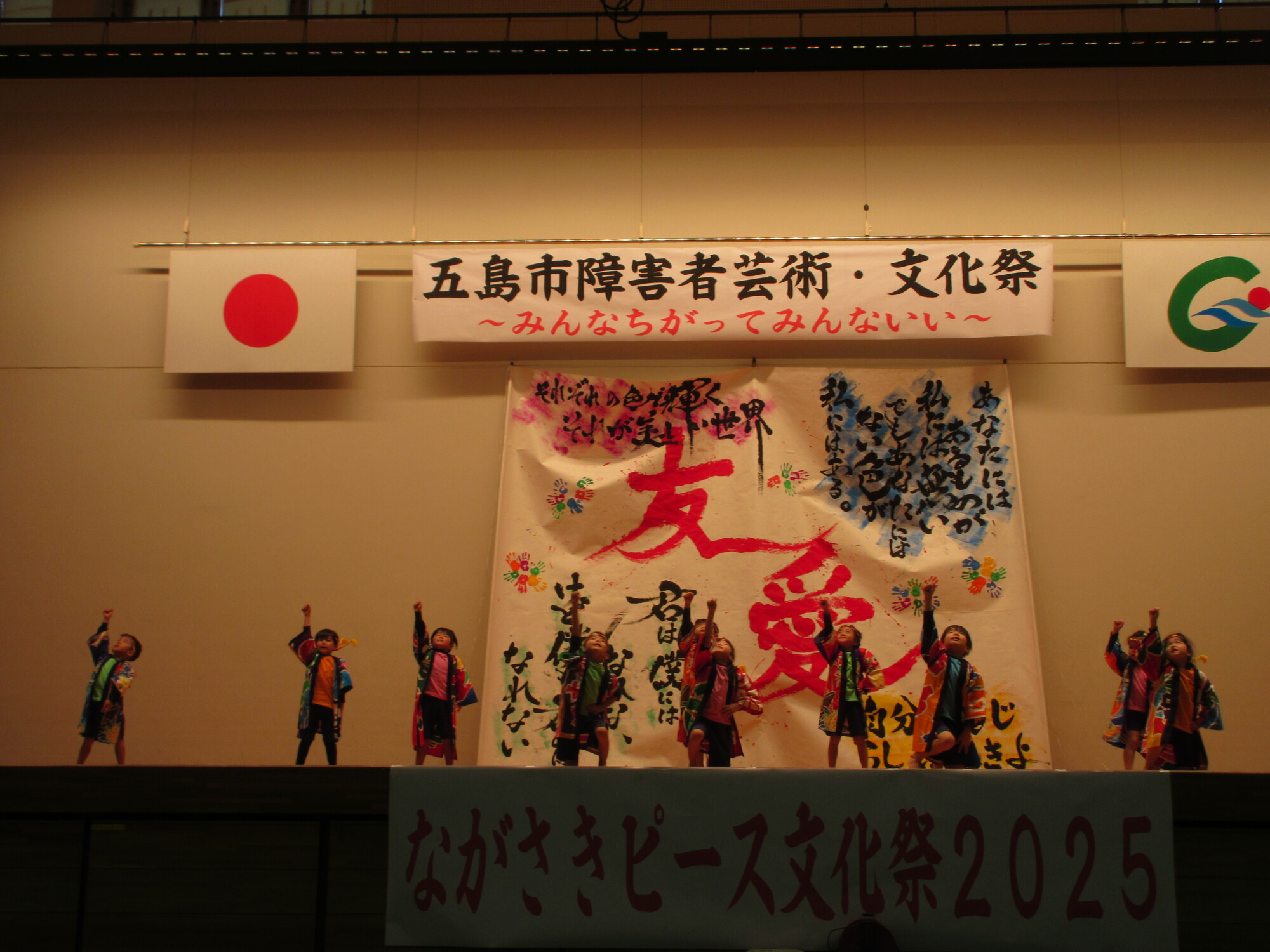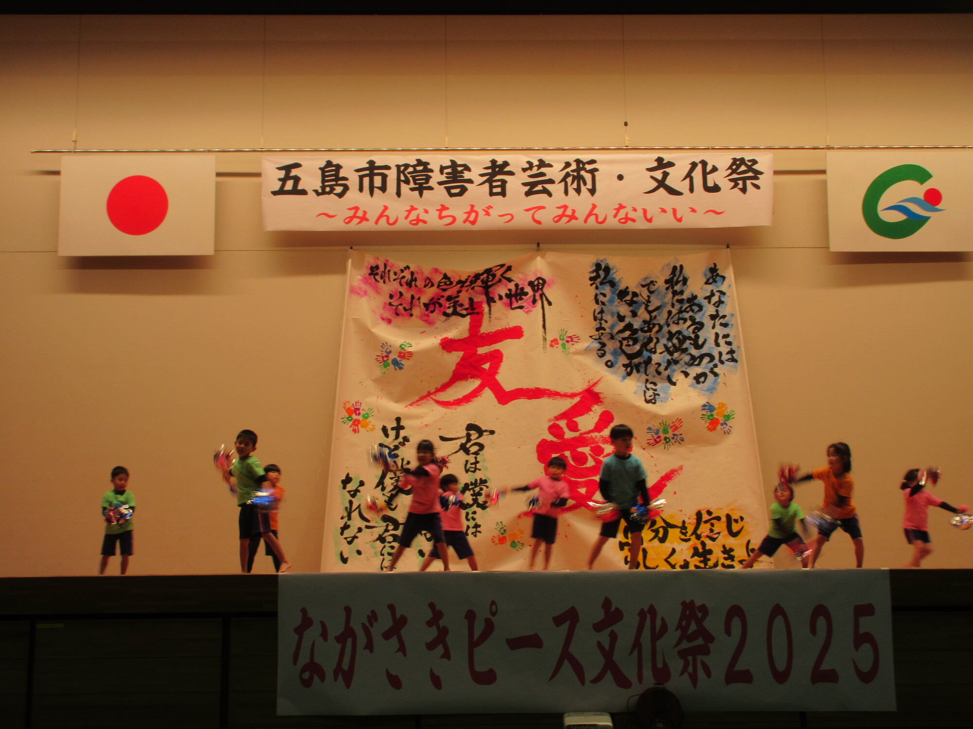 五島市障がい者芸術・文化祭2025に⒋・5歳児10名の園児が参加しました。最初に、開会宣言を4名が元気に行うことができました。 その後に、「南中ソーラン」と「マスカット」を踊り、「ありがとうの花」を手話を交えながら歌いました。子どもたちは、元気に笑顔で参加し会を盛り上げることができました。