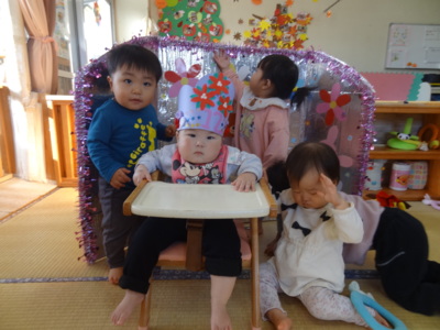 今日は、入園・進級お祝い会でした。3名のかわいいお友達が仲間入りしました。子どもたちは新入園児を迎えたこととそれぞれの進級を喜び合いました。園長先生から担任の先生の紹介や新入園児の紹介がありました。